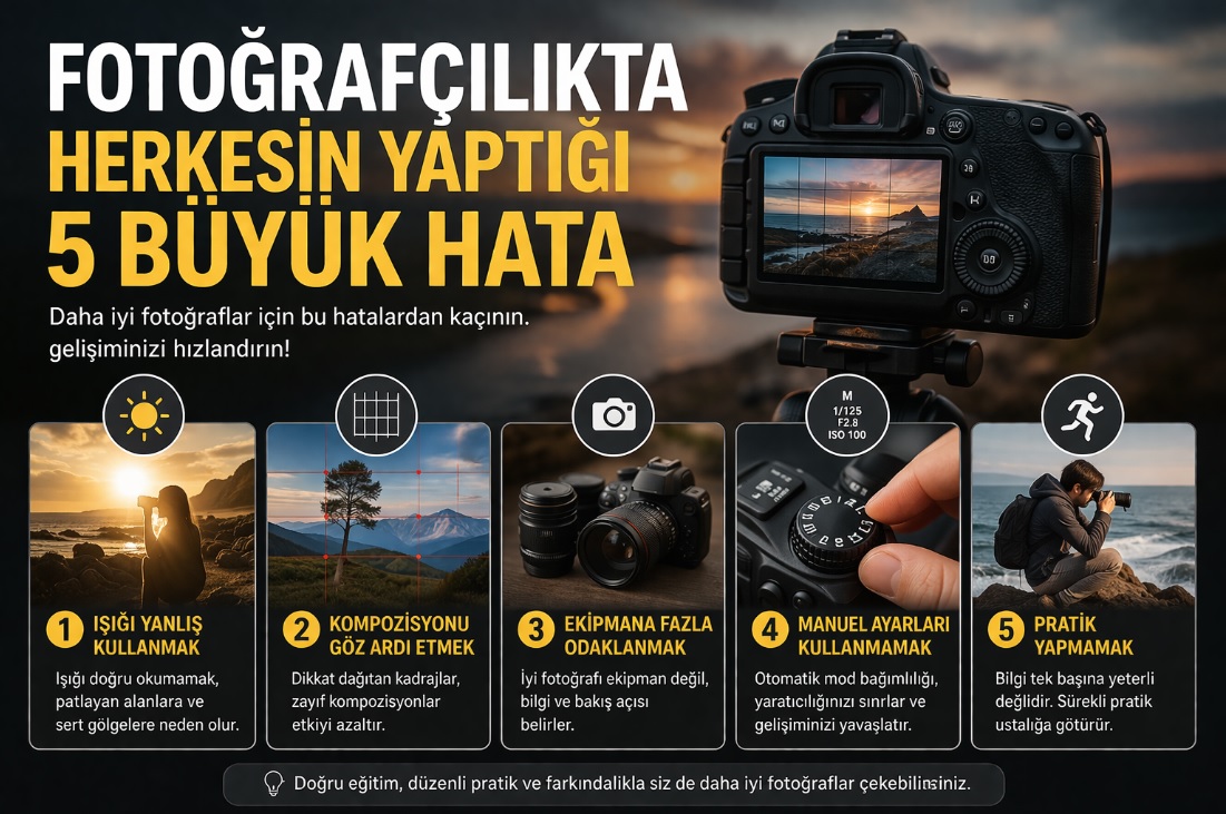 Fotoğrafçılıkta Herkesin Yaptığı 5 Büyük Hata aslında gelişimin önündeki en büyük engellerdir. Doğru bir fotoğraf kursu ile bu hataları hızlıca aşabilir, fotoğrafçılık yolculuğunda güçlü bir sıçrama yapabilirsin.